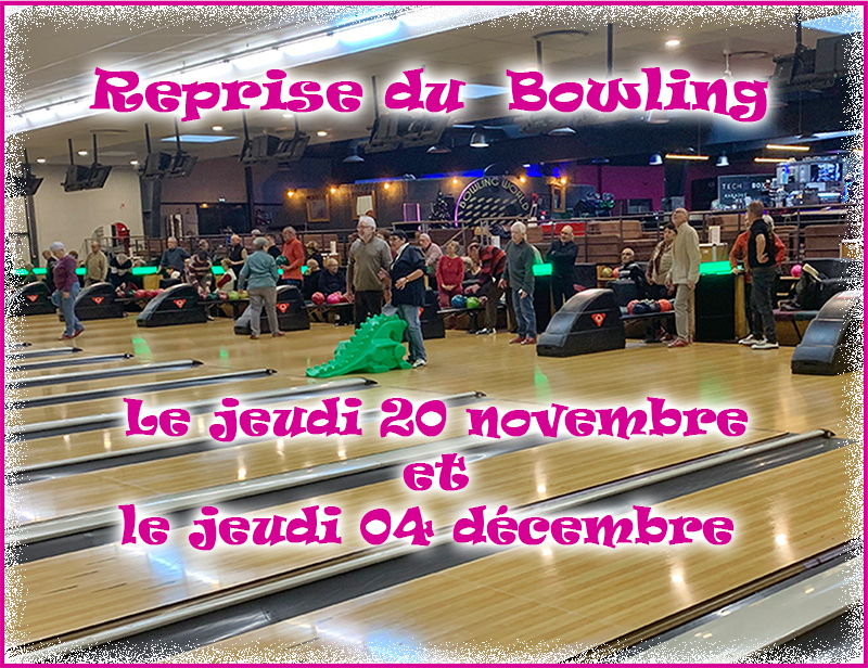 Pour la fin de l’année, nous vous proposons 2 après-midi Bowling les jeudis 20 novembre et 4 décembre de 14H00 à 17H00.