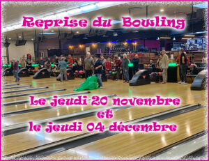 Pour la fin de l'année, nous vous proposons 2 après-midi Bowling les jeudis 20 novembre et 4 décembre de 14H00 à 17H00. INFORMATIONS/INSCRIPTIONS: