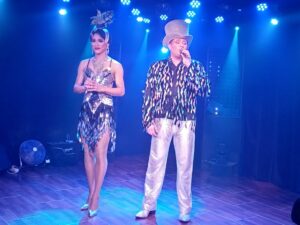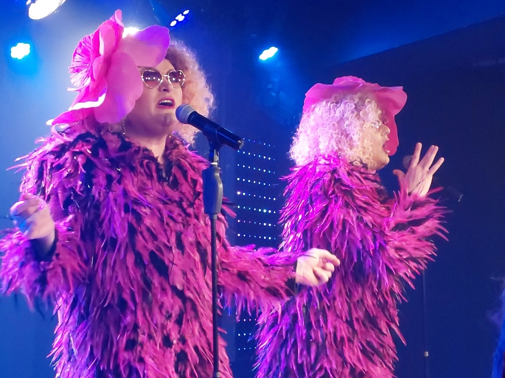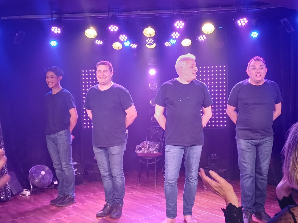 Chapeaux extravagants et costumes rutilants dignes des plus grandes revues du genre, habillent gracieusement les quatre transformistes très justes dans leur interprétation et prêts à faire participer les spectateurs, quelquefois surpris, très surpris même, sous les rires sans retenue de leurs copains, ravis de s’être installés au fond de la salle !