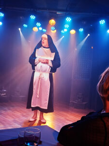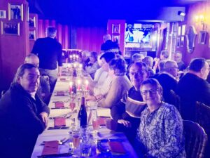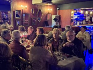 Les artistes qui vont assurer le show servent un apéritif de bienvenue suivi d’un repas délicieux accompagné de vin blanc et rouge, et terminé par un café gourmand très apprécié de tous. Gentillesse et bienveillance animent le personnel.