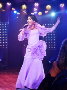 Dans la salle de spectacle, sur les tables dressées avec chic et soin, les chandeliers de bougies rouges garnis, diffusent une lumière enchanteresse, qui joue avec les nombreux et délicats miroirs qui ornent les murs.